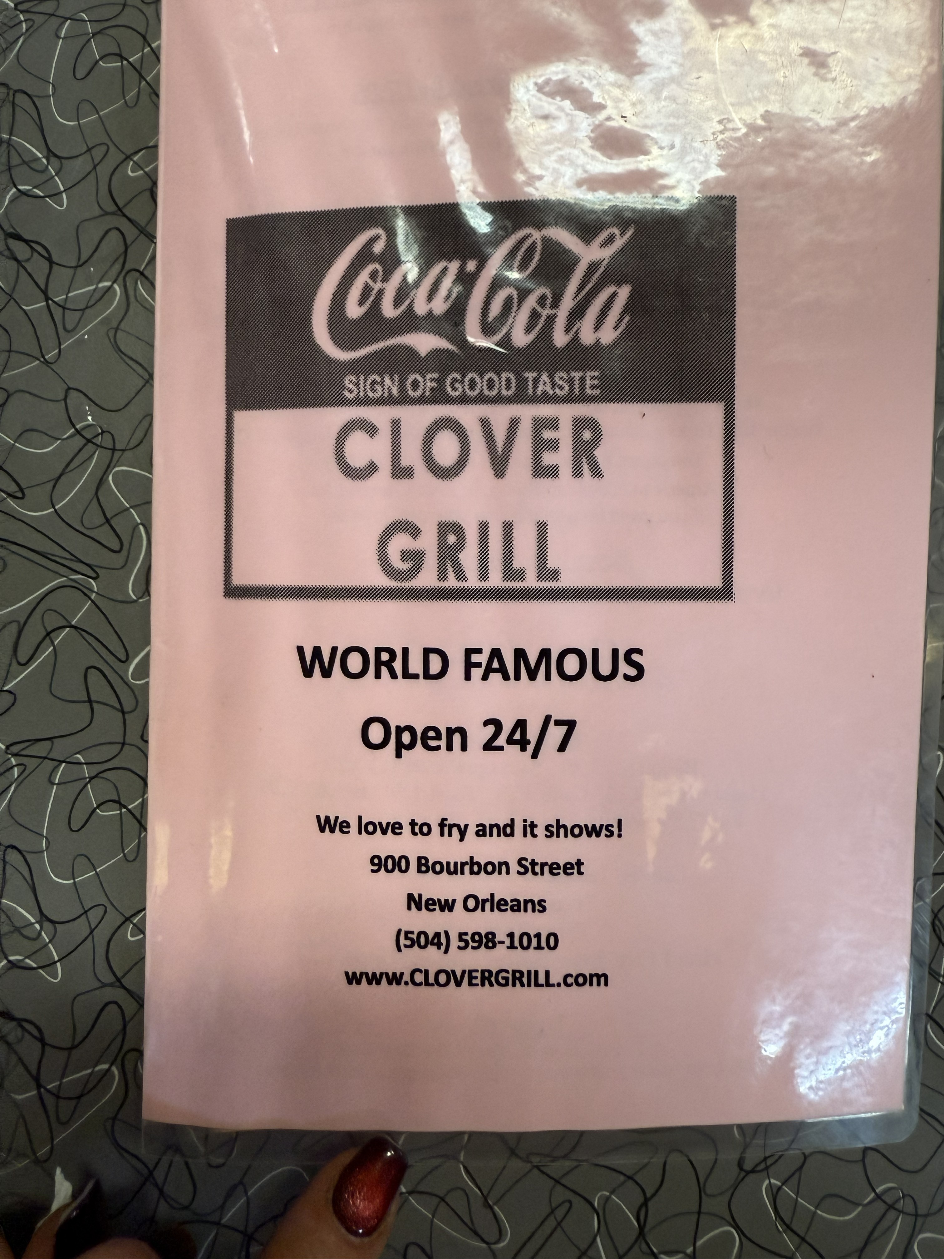 One of our favorite surprises was Clover Grill, a great little 24/7 diner‑style grill. The food was delicious, the atmosphere was fun, and the servers were so friendly. It felt like one of those classic New Orleans spots where everyone is welcome, and the coffee never stops pouring.
